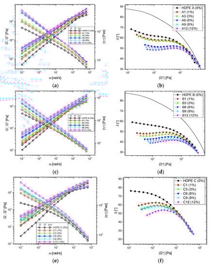 (a) dynamic-mechanical modulus and viscosity functions of the blends of (a) HDPE A, (c) HDPE B, and (e) HDPE C. Corresponding δ(|G*|)-plots for (b) HDPE A, (d) HDPE B, and (f) HDPE C. T = 150 °C, γ0 = < 5%.