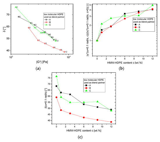 Comparison of the dynamic-mechanical data obtained for the base materials and blends at ω = 0.1 rad/s and T = 150 °C. The concentration of HMW-HDPE c is denoted as a number next to each datapoint. (a) δ (|G*|)-plot, (b) viscosity change normalized to viscosity of low molecular blend partner |η*(ω = 0.1 rad/s, (c) |/|η*(ω = 0.1 rad/s, c = 0)|, (c) δ(ω = 0.1 rad/s).