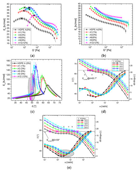 Figure 6d and e show a comparison of the δ(ω)-plots of HDPE A and A3. In these plots, the position of Ea,max (δmax = 63.7° and 59°, respectively) is marked by the horizontal line, and the pink x marks the points where δ(|G*|; T = 150, 170, 190, 210, and 230 °C) cross this value. Further, the other material’s corresponding values are given in the respective plots as small black × to illustrate the differences better. The comparison between these two samples, differing by the 3% addition of HMW-HDPE, leads to significant differences in the phase angle functions δ(ω). Namely, the plateau of A3 is significantly widened and flattened to the extent that for 150 °C, an almost constant value of δ is found for ω = 1 … 10 rad/s. As a consequence, the spread between the data at 150 °C and 230 °C at δ = 59° is significantly larger than the corresponding spread for HDPE A at δ = 63°.