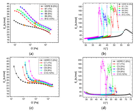 Activation energy spectra of (a,c) storage modulus (Ea(G′)), (b,d) phase angle (Ea(δ)) of (a,b) HDPE B blend series, (c,d) HDPE C blend series.