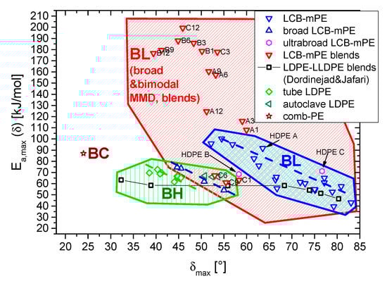 Figure 8 shows the Ea,max(δmax) plot for all samples investigated by the authors and some literature values. The topographies (1) branched with few long-chain branches (LCB-mPE)→BL, (2) highly long-chain branched (LDPE)→BH, and branched with comb-like topography→BC are marked clearly as areas in the same color as the respective symbols for individual samples [58].