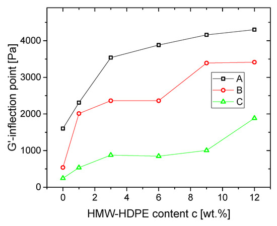 Secondly, the higher the molar mass of the low molecular material, the lower the G′ at which the inflection point curves are found. This trend can be understood only to be the consequence of the combination of several parameters. Firstly, as the HMW-HDPE is the same for all materials, a higher molar mass of the low molecular HDPE means that both molar mass ratio of the blend partners varies as HDPE A-blends > HDPE B-blends > HDPE C-blends. The difference between the low molecular base polymers HDPE A, HDPE B, and HDPE C is primarily in Mw, Mw/Mn, and the LCB-content, which balances out the differences in molar mass, as the viscosity functions of the three base materials are very similar (Figure 1). The lower LCB-content of HDPE B and HDPE C leads to an inflection point at rather low G′. This indicates that the long-chain branches only become evident at low G′/low ω, indicating that they only have few, but long long-chain branches mostly stemming from HMW-HDPE, as can be expected from the high molar mass of HMW-HDPE.