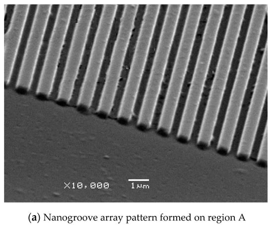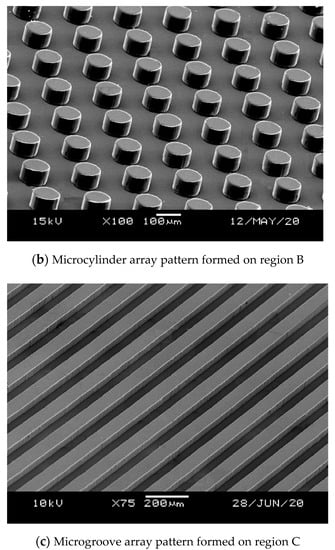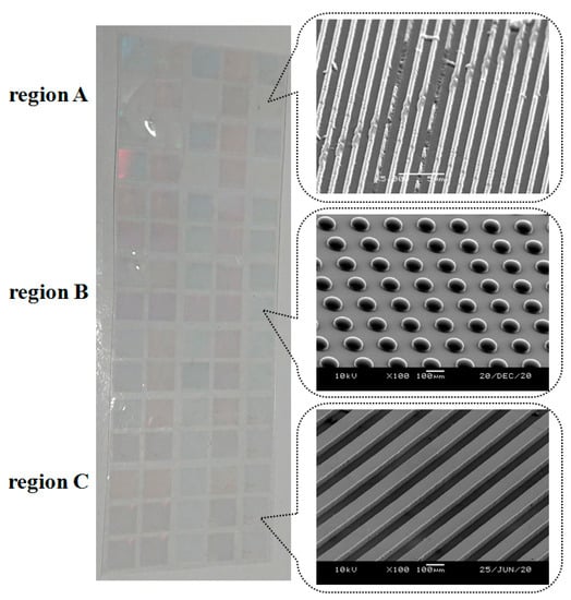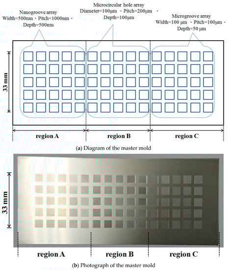In this experiment, a master mold with large-area and multiscale microstructure patterns was fabricated. Figure 1 shows the diagram and photograph of the master mold. The master mold was fabricated from stainless steel material (SUS 304L). The surface of the thin stainless-steel mold was divided into three regions, each with a different microstructure pattern. In each region, 25 small square areas formed the microstructure patterns. The microstructure patterns of region A, region B, and region C were a nanogroove array, microcircular hole array, and microgroove array, respectively. The width, pitch, and depth of nanogroove array were 500, 1000, and 500 nm, respectively. The diameter, pitch, and depth of the microcircular hole array were 100, 200, and 100 μm, respectively. The width, pitch, and depth of microgroove array were 100, 100 and 50 μm, respectively.