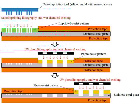 The fabricating procedure of the master mold with three different microstructure patterns is shown in Figure 2. First, a thin (0.15 mm thick) stainless steel plate (SUS 304L) was cleaned and chemically polished. Then, the surface of the stainless steel plate was divided into three regions; when one region was being processed, the other two regions were protected. Consequently, the microstructure patterns of region A, region B, and region C were sequentially manufactured. In the first stage, a nanogroove array pattern was fabricated on region A through standard nanoimprinting lithography and wet chemical etching. Here, a silicon mold with a nanopattern as a nanoimprinting tool was prepared using e-beam lithography and reactive-ion etching technology. After the nanoimprinting lithography process, the thin stainless-steel substrate with the imprinted-resist pattern was then soaked in an etchant during the etching process. The chemical composition of the etching solution was 10 wt% FeCl3, 15 wt% HCl, and 3 wt% HNO3. The wet etching process was conducted at 40 °C for 5 min, following which the nanogroove array pattern on the thin stainless-steel plate was obtained. In the second stage, a dry film photoresist (ETERTEC® HT-115; Eternal Materials Co., Ltd., Taiwan) was laminated on region B of the stainless steel plate by using a dry-film laminator. The thin stainless-steel plate with the dry-film photoresist layer was then exposed to UV radiation through a photomask with a microcircular array pattern for 15 s using a UV-exposure machine. The photoresist layer was then dipped in a developer solution (1.2% Na2CO3·H2O) for 35 s, following which the microcircular hole array pattern on the photoresist layer was obtained. The thin stainless steel plate with the photoresist pattern was then soaked in an etchant (10 wt% FeCl3, 15 wt% HCl, and 3 wt% HNO3) during the chemical etching process. The wet etching process was conducted at 40 °C for 60 min. Then, the dry-film photoresist layer was stripped using a 5% NaOH solution. The microcircular hole array pattern on region B of the thin stainless steel plate was thus obtained. Finally, in the third stage, a microgroove array pattern was fabricated on region C of the thin stainless steel substrate. The fabrication process in the third stage was similar to that in the second stage; only the photomask pattern design and wet etching time were changed.