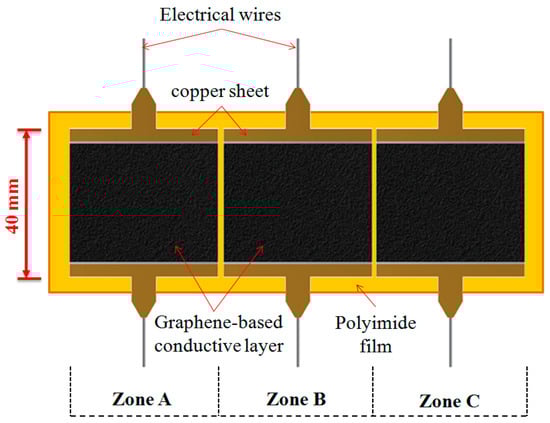 In recent times, graphene and graphene-based composites have attracted considerable attention for use in heater applications because of their unique properties, including high electrical conductivity, outstanding mechanical properties, large specific surface area, and high heat conductivity. In this study, a thin and large-area heater with nonuniform heating function was fabricated through a screen-printing process with graphene-based conductive inks. The screen printing inks were composed of graphene powders (45%) and epoxy resin (25%); these inks were prepared in-house. The viscosity of a graphene-based conductive ink is 18,000 ± 1000 cps. Figure 3 presents a design drawing and construction of the thin graphene-based heater with three heating zones. A polyimide film with high-temperature resistance was used as a printing substrate. After the screen-printing process, the graphene-based conductive ink was cured at 150 °C for 30 min. Then, copper sheets were glued to both ends of the graphene-based conductive layer, serving as electrodes for supplying the input voltage to the heater. To increase the service life of the thin graphene-based heater, a transparent epoxy resin was coated on the surface of the heater as a protective layer. In the experiment, the average thickness of graphene-based conductive layers was 20 ± 3 μm. The average electrical resistance of the graphene-based heaters was 35 ± 5 Ω sq−1, and their surface roughness was characterized through atomic force microscopy conducted at measurement points in the middle of the heaters. The average surface roughness and minimum surface roughness were 20.3 and 12.1 nm, respectively.
