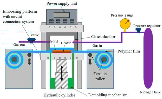 In recent years, polymer micro- and nanostructure devices have attracted increasing interest owing to their many potential applications. One of the methods for fabricating large-area polymer micro- and nanostructure devices is the hot embossing process, where the structures of a master mold are copied onto a polymer substrate. This process is cost-effective and facilitates mass production; therefore, it is widely used for fabricating optical films, biochips, small sensors, etc. Thus far, many effective polymer hot embossing methods have been proposed and developed, such as plate-to-plate hot embossing [,,], gas-assisted hot embossing [,,,], ultrasonic hot embossing [,,,], roller hot embossing [,,,], soft mold-based hot embossing [,,,], and rapid hot embossing [,,]. Most of these methods are isothermal hot-embossing processes with a uniform heating system. The steps involved in these methods are heating, embossing, cooling, and demolding. To date, many studies have experimentally and numerically investigated the deformation and flow behavior of thermoplastic polymer during hot embossing [,,,]. The replicated pattern quality of the hot embossed part is significantly influenced by the process parameters, such as embossing pressure, embossing temperature, and holding time [,,,,]. Furthermore, the effects of the geometric structures and size of the mold cavity on the hot embossing process are critical issues that need to be addressed, because the polymer replication ratio and filling height of the hot embossed product share a complicated nonlinear relationship with cavity size and density [,,,]. A nonuniform filling phenomenon is observed when a single embossing master mold contains multiple, nonuniform feature geometries. Nonuniform filling often leads to molding or demolding-related defects, such as residual stress, product warpage, damaged microstructures, and distorted features. Thus, effectively and uniformly replicating large-area multiscale microstructures is difficult in the polymer hot-embossing process. In addition, most traditional hot embossing machines have inherent problems because of the uniform heating system and pressing mechanism involved in using upper and lower hot plates or hot rollers. Consequently, multiple and nonuniform temperatures cannot set in traditional hot embossing machines for the hot embossing of large-area polymer microstructures with multiple scales or complex patterns. Furthermore, controlling and increasing the yield and stability of the polymer hot embossing process with multiscale microstructures are difficult.