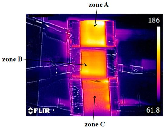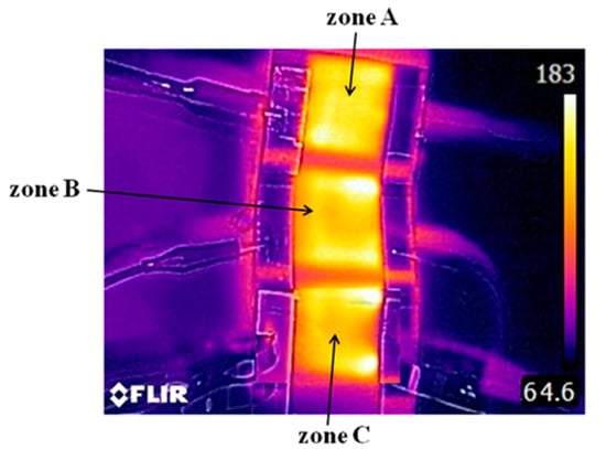Temperature distribution of the graphene-based heater when input voltages of 30, 25, and 20 V were applied to zones A, B, and C, respectively. (The average steady-state temperatures of zones A, B, and C were 180 ± 3 °C, 145 ± 3 °C, and 116 ± 4 °C, respectively).