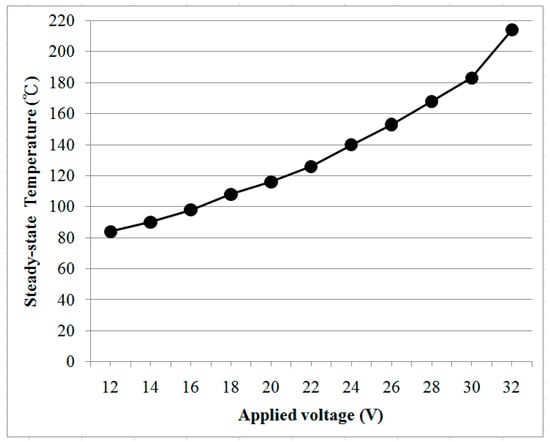 Steady-state temperature versus applied voltage of the graphene-based heater with three heating zones.
