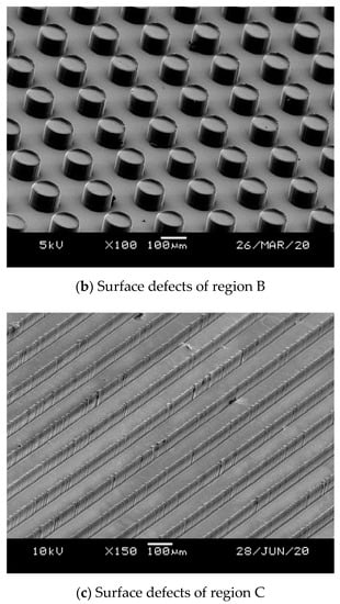 Surface defects in the microstructure patterns on region A, B, and C. (When the embossing pressure and embossing time were maintained at 30 kg cm−2 and 120 s, the practical embossing temperatures of zones A, B, and C were set to 179.5, 181.5, and 182.7 °C, respectively).