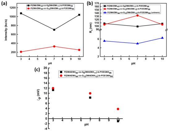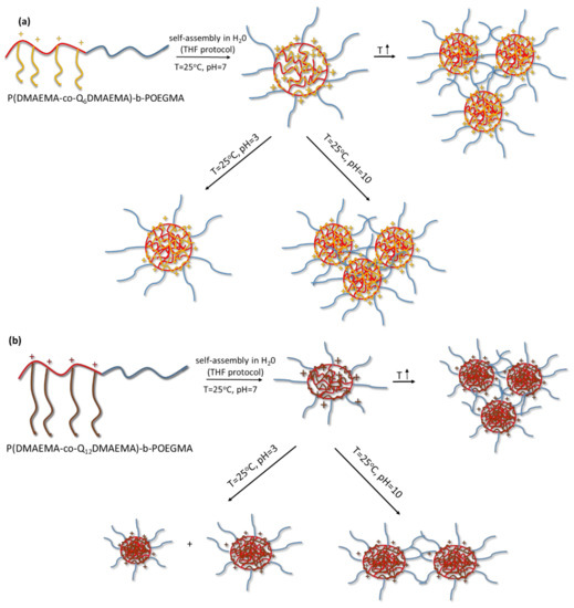 - Chrysostomou, V.; Pispas, S. Stimuli-responsive amphiphilic PDMAEMA-b-PLMA copolymers and their cationic and zwitterionic analogs. J. Polym. Sci. Part A Polym. Chem. 2018, 56, 598–610. [Google Scholar] [CrossRef]