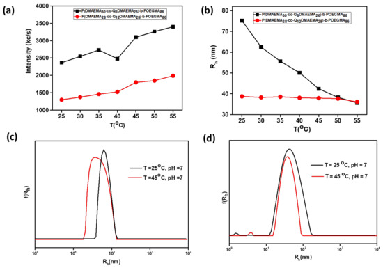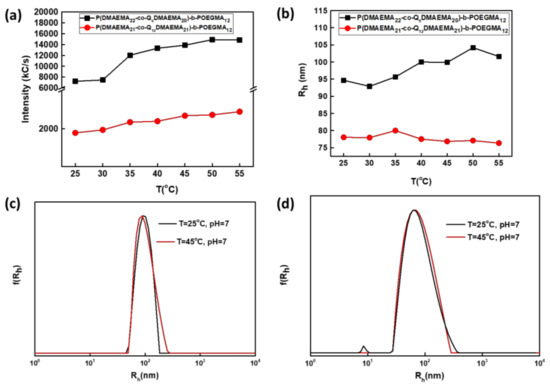 3.2.2. Temperature-Dependence of the Self-Assembly Behavior of the P(DMAEMA-co-Q6/12DMAEMA)-b-POEGMA Random Diblock Copolymers