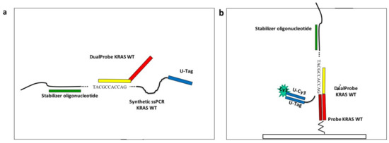 Scheme of the assay. (a) In the case of KRAS wild-type allele, the Stabilizer oligonucleotide (green rectangle) hybridizes in solution with the synthetic single strand PCR (ssPCR) to keep the synthetic ssPCR sequence stretched, then the Dual-Probe 5’ domain (yellow rectangle), complementary to the KRAS wild-type synthetic ssPCR, hybridizes in solution with its specific sequence inside the synthetic ssPCR. (b) The sequence in the 3’ domain of the Dual-Probe oligonucleotide (red rectangle) directs the synthetic ssPCR to its complementary capture probe on the array (dark red rectangle). The position in the array is revealed when the U-tag sequence at 5’-end of the synthetic ssPCR (blue rectangle) interacts with the complementary Cy3-labeled oligonucleotide, Universal-Cy3 (U-Cy3), added in the last step of the assay.