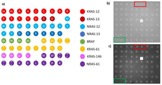 Scheme and images of the multiplexed chip utilized for IRIS quality control assay. (a) Spotting scheme of the 33 oncogene capture probes, where different colors indicate a different codon or gene. (b) IRIS image of a chip where KRAS-12 C (red rectangle) and NRAS-61-ht (green rectangle) were absent due to poor immobilization. (c) IRIS image of a new chip where immobilization for KRAS-12-C was optimized (red rectangle).