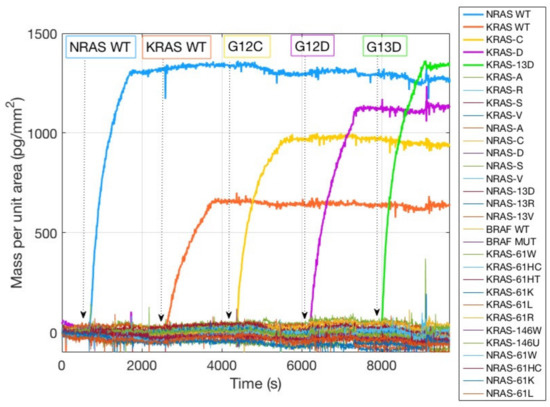 Figure 3 shows the spotting scheme of the 33 oncogene capture probes corresponding to the KRAS, NRAS, and BRAF oncogenes, together with the initially immobilized mass for all the dry spotted probes. The surface density is fairly consistent across most spots (Figure 3b,c), confirming the ability of MCP-4 polymer to stably immobilize amine-modified probes. However, two probes were not immobilized correctly, in particular KRAS 12C and NRAS 61HT (Figure 3b red and green rectangles). There could be more than one explanation for the immobilization failure: aging of the capture probe can be a motivation, but most probably the amine tail on the DNA strand was deteriorated, and the coupling reaction did not perform as expected. The replacement of the old probe with a fresh one, resulted in a better immobilization in terms of probe quantity (2 ng/mm2 vs. 0.4 ng/mm2, see Figure S1 Supporting Information), as it can be noticed from Figure 3c, red rectangle. Lack of immobilization as that evidenced in Figure 3b would inevitably lead to a negative result in the detection of that specific mutation since the recognition event cannot occur, thus affecting and invalidating the diagnostic capability of the assay. On the contrary, thanks to this label-free quality control method, the user can quickly establish if there is a problem connected to the immobilization step, gaining a piece of information that is impossible to obtain with fluorescence. The real-time hybridization experiment was performed in order to validate the specificity of the probes by introducing into the fluidic cell oligonucleotide sequences (Dual probe reporters) complementary to five of the spotted probes. As it can be observed in Figure 4, all the target sequences are highly specific since they only bind to their complementary on the surface. Non-specific binding was not detected on any of the other spotted mutations.
