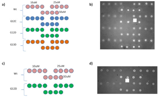 In order to measure the effect of surface density on probe reactivity, three different concentrations of a set of distinct KRAS mutations were spotted on MCP-4 or Copoly azide 10% functionalized IRIS chips. Overall, four mutations were immobilized on MCP-4-coated chips, while two were spotted on azide-modified substrates. The spotting scheme for these experiments is reported in Figure 5, together with IRIS images of the dry chips, taken before starting the experiment.