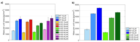 Immobilized mass of the probes spotted on (a) MCP-4 and (b) Copoly Azide 10% coated chips, obtained by analyzing the IRIS images of Figure 5.