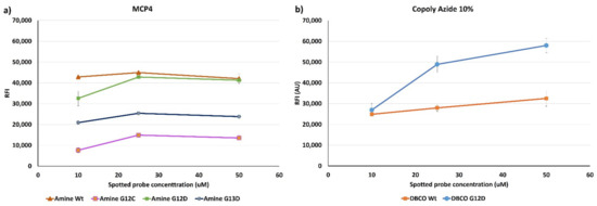 A second investigation was performed in order to determine the best spotting concentration to preserve the reactivity of the probes. At the same time, the difference in terms of immobilization strategy was evaluated. To this extent, the immobilization through NHS active ester (obtained on MCP-4 coated surfaces) was compared to that achieved on a surface coated with an azide bearing copolymer, which allows a click-chemistry based immobilization through a 1,3-dipolar cycloaddiction reaction [20]. In this case, all the capture probes were modified with a DBCO group instead of an amine; the coating and spotting procedure were, however, identical to those reported in Section 2.2.