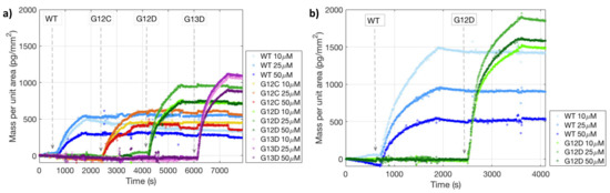 The solutions of NRAS wild type, KRAS 12-13 wild-type, KRAS G12C, KRAS G12D, and KRAS G13D dual-probe oligonucleotides, each at a 50 nM concentration in 2X SSC buffer, were sequentially injected into the system and recirculated for 20 min at an average flow-rate of 200 µL/min. After the injection of each different dual-probe oligonucleotides, a washing step of 2X SSC buffer for 10 min was performed. Incubations and measurements took place at room temperature. Interferometric images of the binding to the corresponding capture probes were acquired during the whole process with a blue LED light (452 nm). There were four-color images, used to generate a look-up table for the conversion to mass density, acquired at the beginning of the experiment [25]. The binding curves were generated by converting the reflectance data to mass density (pg/mm2), then subtracting the background signal from the spot signal, and finally averaging the differential signal obtained from identical probe spots.