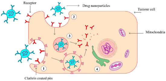 The scheme of endocytosis of the nanoparticle modified by antibodies that recognize cancer markers at the cell membrane. (1) Receptor (aptamer or antibody) on the drug-loaded nanoparticles recognize the clathrin-coated pits in the tumor cell and bind to it. (2) Phagocytosis of drug-loaded nanoparticles facilitates the transport of the carrier into the tumor cells. (3) An endocytic vesicle is formed. (4) Endosome induces the release of drug from the nanoparticles and penetrates into the nucleus. Reproduced from [21] with the permission of Elsevier.