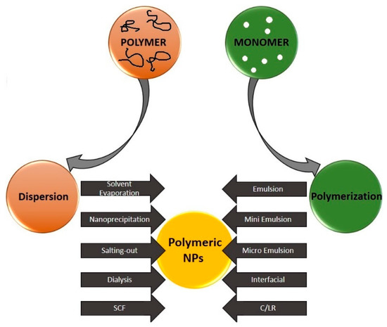 In general, methods of nanoparticle synthesis can be divided into three groups: physical, chemical, and biological. Recently, several techniques for the synthesis of polymeric nanoparticles have been developed. They are classified depending on whether the formation process involves a polymerization reaction or whether polymer nanoparticles (PNPs) are formed directly from the macromolecule (Figure 3). The possibilities of PNPs synthesis can be divided into two main groups:
