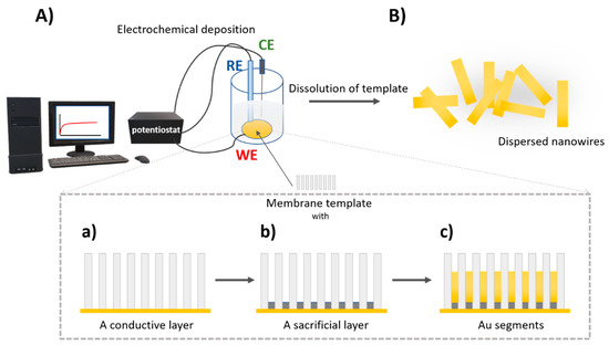 The scheme of preparation of nanowires using a membrane template-assisted electrodeposition (A) the three-electrode electrochemical cell using a membrane with a conductive layer as a working electrode (WE), RE—reference electrode, CE—counter electrode. Detailed view of electrodeposition process in a membrane (a) a sputtered conductive layer e.g., Au, (b) electrodeposition of a sacrificial layer, (c) electrodeposition of nanowire Au segment; (B) removal of a sacrificial layer and membrane resulting in free nanowires in water.