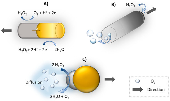 Autonomous self-propelled motors provide perspective in biomedical [82] and environmental applications [83]. Motion of catalytic nano/micromotors follows several propulsion mechanisms. The movement is based mainly on the decomposition of chemical fuel e.g., hydrogen peroxide to water and oxygen on asymmetric bimetallic nanorods due to proton gradient among their surfaces. Platinum (Pt) is widely used for catalytic reaction and the motion forward Pt end is caused by the generation of an electric field through electron flow (Figure 5). This process is called self-electrophoresis [84]. In 2004 and 2005, Mallouk’s [85] and Ozin’s [86] groups demonstrated that bimetallic nanowires Au-Pt and Au-Ni were propelled by electrocatalytic decomposition of H2O2 by Pt and Ni segments, respectively. The bubble propulsion is common for nanomotors with microtube shape. The inner side of the tube usually consists of Pt catalyst, the fuel e.g., H2O2; enters inside to tube producing oxygen bubble (Figure 5B). Similarly, as for bubble propulsion as well as for diffusiophoresis, the direction of motion is away from catalyst site. Diffusiophoresis is another approach for propulsion based on asymmetric nanostructure resulting accumulation of reaction products on one side. Then, the movement is caused by asymmetric gradient of products (Figure 5C). The motion toward to catalyst can be explained by interfacial tension, where products are accumulated on the Pt side, creating interfacial tension gradient [84,87].