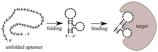 One of the key capabilities of aptamers is changing their 3D structure under certain physical and chemical conditions. This change is induced by the environment as well as by their targeting molecules. The specific molecule (ligand) induces formation or stabilization of the structure of the aptamer binding site. Typical 3D structures include the stem, loop, triplex/quadruplex, or hairpin [131]. There are several types of interactions between aptamer and ligand such as hydrogen bonds, hydrophobic/electrostatic interactions, Van der Waals interactions or aromatic stacking [132,133]. The dissociation constant is usually in the pico–nanomolar range [125]. The scheme of aptamer folding and interaction with target is presented on Figure 7.