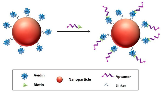 Avidin-biotin coupling (Figure 9) can be obtained through Van der Waals forces and hydrogen bonds. Avidin-biotin bond is known to be the strongest, non-covalent bond with a dissociation constant of ≈10−15 M [195]. In the study of Ninomiya et al. [197] biotinylated aptamers were conjugated on avidin-treated liposomes. Thermosensitive doxorubicin-loaded poly(NIPMAM-co-NIPAM) nanoparticles were studied against breast cancer cell lines. The aptamer functionalized liposomes have proved to be efficient against chosen breast cancer cell lines.