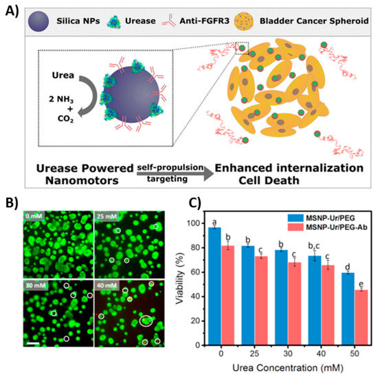 - Hortelao, A.C.; Carrascosa, R.; Murillo-Cremaes, N.; Patino, T.; Sánchez, S. Targeting 3D bladder cancer spheroids with urease-powered nanomotors. Acs Nano 2019, 13, 429–439. [Google Scholar] [CrossRef] [PubMed]