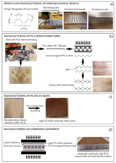 The development of the PLA-core sandwich structure was carried out in different stages: (a) Manufacturing of the hexagonal mold, (b) manufacture of the PLA-based honeycomb core, (c) manufacture of the PLA-flax outer sheets reinforced, and finally (d) bonding of the honeycomb core to the skins by means of adhesive joints as it is summarized in Figure 1.