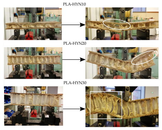 Figure 3 left column pictures show the elastic region for all three composite sandwiches as the corresponding force–displacement curves show. Clear signs of debonding (white ellipse) can be observed for PLA-HYN10 (right column). After this initial debonding, the load is shared by the core and the nondebonded skins until the core or the skin fails. As it can be seen in Figure 3, PLA-HYN-10 failure occurs by breakage of the core and the bottom face, while in PLA-HYN-20, failure occurs by progressive debonding (white ellipse) as its corresponding force–displacement curve suggests. Regarding the composite with a 30 mm PLA honeycomb, failure occurs in a different way. It seems that the core–skin adhesion is not as good as in other composites, and the core fails by shear at a relatively low force of 912.5 N. The failure image (Figure 3) shows a clear buckling-shear combined effect on the PLA honeycomb core that promotes early failure (white square). Similar results have been reported by Li et al. [48] in composite sandwiches subjected to out-of-plane loads, while Khan et al. [49] carried out an in-depth experimental study on the damage of honeycomb sandwich panels and compared the experimental results with those obtained by finite element analysis (FEA).