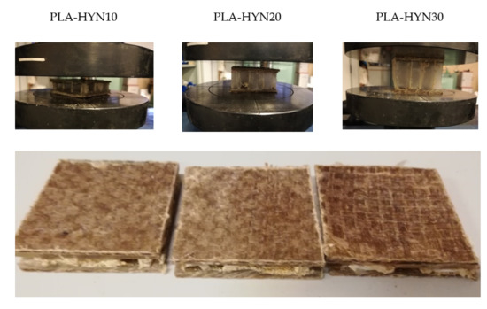 Concerning the flatwise-compressive properties of the sandwich structures, Figure 4 shows the characteristic force–displacement curves, while the damaged samples after compression are gathered in Figure 5. The force–displacement curves show an elastic behavior before a maximum compression load is reached. This is close to 5620 N for the PLA-HYN10. Above this, the core collapses and, finally, when both skins are almost in contact, the force increases, as the densification stage is reached, as reported by Feng et al. [54]. Similar behavior can be observed for the other tested composites; nevertheless, the densification stage is delayed as the core thickness increases.