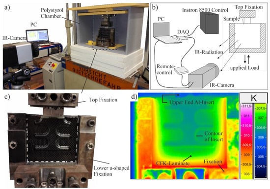The mechanical tests are carried out on an Instron 8500 with a 100 kN load cell. The data acquisition rate is 1 kHz. For mounting the specimen side-screw action grips are used. The clamping length is 25 mm at the aluminum-insert and at the bottom of the CFRP-laminate, as well as 10 mm on left and right side of the CFRP-laminate (see Figure 2). The setup is complemented with a InfraTec VarioCam® HD Head bolometer camera for in situ passive thermography. The camera has a resolution of 1024 × 768 pixels, a spectral sensitivity in the range of 7.5 to 14 µm and a noise equivalent thermal detectability (NETD) smaller than 0.05 K (at T = 303.15 K). The camera is placed at a distance of 70 cm orthonormal to the specimen adjusting the focus plane on the CFRP surface (Figure 2d).