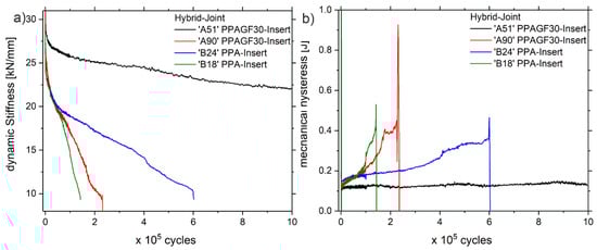 Figure 3. (a) Evolution of the dynamic stiffness of the hybrid-joints with PPA- and PPAGF30-insert-types during fatigue loading, (b) corresponding evolution of the mechanical hysteresis, note that two examples are displayed for each of the insert-types named ‘A51’, ‘A90’, ‘B24’ and ‘B18’.