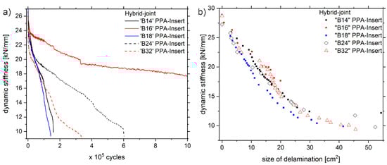 The discussed evolution of delaminations is characteristic of all of the tested specimens of Series ‘A’ and ‘B’, even though a broad scattering is undoubtedly present (Figure 5a). Plotting the dynamic stiffness as a function of the delamination size reveals a strong dependency between these quantities (Figure 5b). Anyhow, the dependency between dynamic stiffness and delamination size does not reflect the testing-series’ scattering regarding the lifetime to failure or the crack growth rate, respectively, and thus is independent of time and rate.