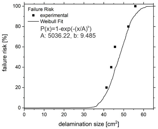 The analysis of the delamination size at the instance of failure for the specimens of the B-series is given in Figure 6. The cumulative amount of failed samples as a function of the delamination size can be expressed as the failure risk. In other words: with the sample failing at 56 cm2, all of the tested samples have failed resulting in a failure risk of 100%.
