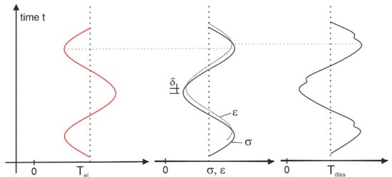 Figure 7. Externally applied mechanical stress ε causes the strain δ with inelastic delay δ, which leads to thermoelastic Tel (left) and dissipational Tdiss (right) variations of temperature with a phase shift of approximately 180°.
