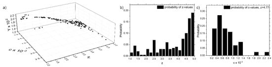 Thus, 200 solutions for c and z result, each representing the least difference between the calculation-model (Equations (7) and (8)) and the experimental values. The room of these 200 solutions and the histograms of z and c-values, respectively, are given in Figure 8, pointing out that all the obtained solutions for c and z lie within a certain domain. However, z results from the histogram-bin with the most probable occurrence being 4.86 (Figure 8b). This histogram-bin, z-values exceeding 4.77 leads to a corresponding set of c-values, whose mean-value will be taken as model parameter c = 7.46 × 10−4 for the latter calculations.