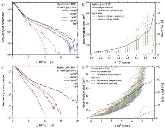 Figure 10. Distribution of dissipation values d1 for samples (a) ‘B18’ and (c) ‘B24’ at five different measuring times n, with the corresponding evolution of delamination size during the experiments of (b) ‘B18’ and (d) ‘B24’, including experimental data (solid line), probabilistic calculated defect size (colored dots) and the resulting failure risk (dashed lines, referring to right axis).
