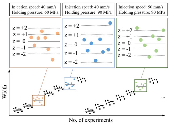 The standard score represents the deviation between the original score and the average value of the population and is calculated in terms of standard deviation. The standard score denotes the number of standard deviations from the point of interest to the average. Figure 1 illustrates the process of filtering outliers from each experimental dataset for the same process parameter settings. Consider, for example, an injection speed of 40 mm/s and holding pressure of 60 MPa; if the z-score is set to 2, then datapoints outside the z-score range [−2,2] can be regarded as outliers. The lower the z-score is, the higher the number of outliers. However, excessive filtering of datapoints may result in a loss of important information, causing a relatively low MLP training performance. Therefore, we used the z-score as a boundary to eliminate outliers, retaining informative data to achieve stable model training.