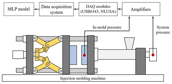 Figure 2 presents a designed MLP-based quality inspection system comprising an injection molding machine, an injection mold for manufacturing integrated circuit (IC) trays, a data acquisition module, two types of pressure sensors, and a computer for MLP modeling. Each component is detailed in the following sections.