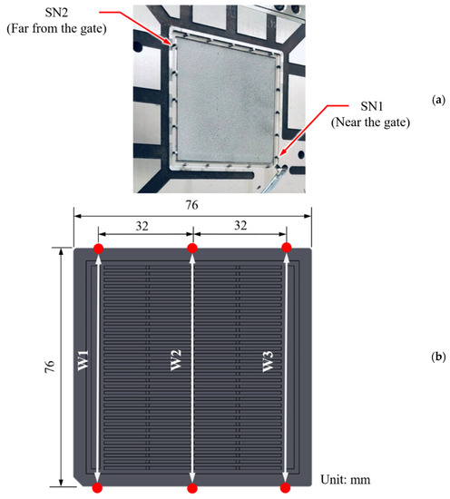 We manufactured IC trays by using an all-electric-driven injection molding machine with a clamping force of 100 t (CT-100, Fu-Chun Shin Corporation, Tainan, Taiwan). The polymer used was an acrylonitrile–butadiene–styrene copolymer (PA-756 Chi-Mei Corporation, Tainan, Taiwan). The ratio of the flow distance to the average tray thickness was 124. The length, width, and thickness of the IC tray were 76, 76, and 4.4 mm, respectively. To investigate the overall flow state of the melt and the quality indices of melt, we installed two types of pressure sensor in the mold—one near the gate (SN1) and one far from the gate (SN2). Figure 3a shows the location of each sensor used in this study. Assuming that the polymer melt will exhibit a laminar flow and because the ratio of the flow distance to the average thickness is high (124); accordingly, the pressure change along the thickness direction is ignored. To sense cavity pressure signals, pressure sensors (SSB01KN08X06H and SSB01KN08X08H, Futaba Corporation, Mobara, Japan) were mounted on the back of the ejectors and the pressure signals are extracted by the DAQ module (USB6343, National Instrument, Austin, USA). The sampling frequency and recording time of each shot are 1000 Hz and 35 s, respectively. That is, the datapoints of each in-mold pressure curve and system pressure curve are 70,000 and 35,000, respectively (i.e., the number of data points at each shot is 105,000). Figure 3b shows the geometry of the IC tray manufactured in this study. The W1, W2, and W3 of the manufactured part are considered as the key qualities and were measured using a precise coordinate measuring machine (CRYSTA-Apex S700, Mitutoyo Corporation, Kawasaki, Japan).