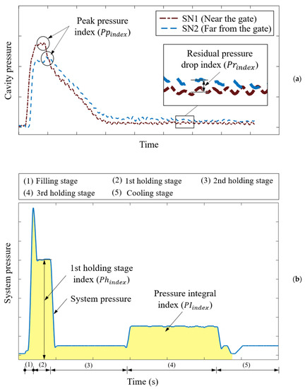 Quality indices: (a) peak pressure index () and residual pressure drop index ( ); (b) pressure integral index ( ) and first-stage holding pressure index .