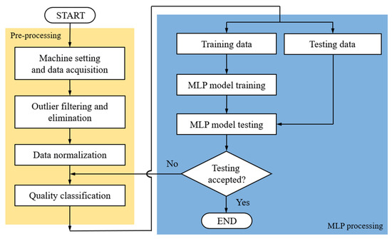 - MLP model testing: When the model testing result meets the user-defined criteria (validation loss value is less than 1), the grade number was used to confirm the category of the predicted width. Otherwise, this step will return to quality classification and redo.