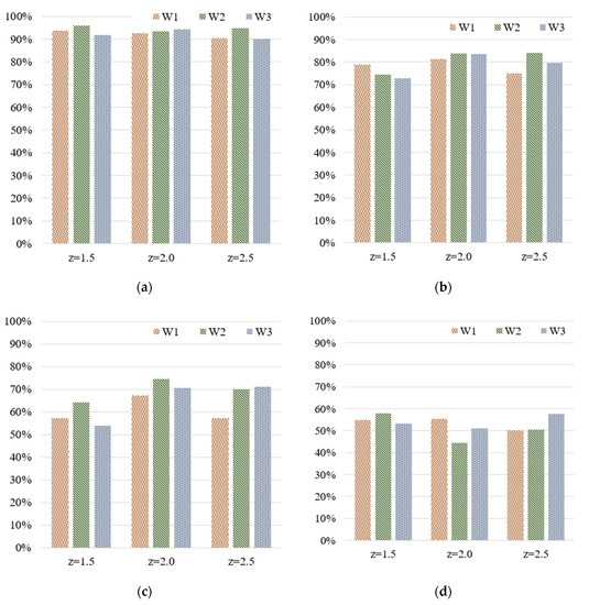 Testing accuracy for the widths of the IC tray with respect to various z-scores and numbers of grades: (a) 5, (b) 10, (c) 20, and (d) 50 grades.