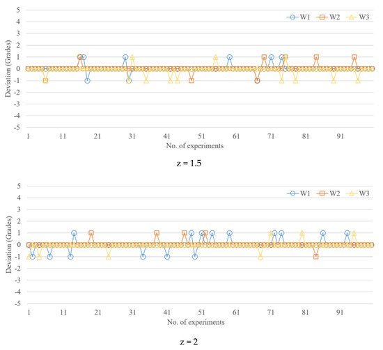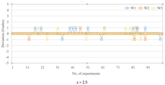 Figure 8 shows width quality deviations observed for 100 test samples, each of which had the three widths; the number of grades was 5. At z-scores of 1.5, 2, and 2.5, the maximum deviation was 1 grade, which was approximately 35 µm. Therefore, the z-score did not have a clear influence on minimizing the prediction deviation. Table 8 shows that for 10 grades, when z-scores are 1.5, 2, and 2.5, the maximum deviations are 3, 1, and 4 grades, respectively. Specifically, a z-score of 2 was associated with the best performance in terms of prediction deviation (i.e., one grade, 17.7 µm). Similarly, for 20 grades, a z-score of 2 was associated with the best performance in terms of prediction deviation (i.e., four grades, 35.6 µm). For 50 grades, a z-score of 2 provided the best performance in terms of prediction deviation (i.e., 10 grades, 35 µm). In summary, the z-score (two, in this case) has a considerable impact on prediction accuracy.