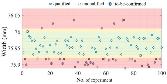 Despite the high accuracy in quality prediction achieved using the proposed MLP model, 100% confidence cannot be guaranteed. Specifically, the quality of parts may not be judged correctly, resulting in manufacturing waste. Accordingly, we designed a narrow “to-be-confirmed” area, which is located between the “qualified” area and the “unqualified” area; we recommend predicting the quality of this area by using the MLP model in the future. Such a process would help prevent errors in judgment; however, such a process does not considerably reduce the burden placed on quality control operators. In this study, two “to-be-confirmed” areas were designed, each with a range of 0.01 mm. Consider, for example, W1 in Figure 9; when 50 grades and a z-score of 2 were considered, the specification limits for the “to-be-confirmed” areas were 76.00–76.01 and 75.92–75.93 mm. Overall, 98 of the 100 test datasets were successfully judged as “qualified” or “unqualified.” However, in the “to-be confirmed” area, two of the 100 test datasets required further confirmation regarding their quality levels. Specifically, the operator must confirm their quality. In industries, the quality of only a few datasets must be confirmed.