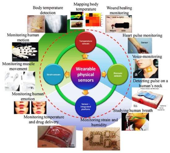 - Sensors [133,134] are preliminary elements for IoTs. Variables which can be sensed include body temperature, blood pressure and heartbeat monitoring [124,135,136]. Flexible IoT sensors have been proposed as a way to monitor the healing of scars [137,138], body tumour detection [139,140], analyzing metabolites in the body [141], wearable flexible signalling system for astronauts [142] and flexible gait tracking sensors and non-contact vital sensors [143].