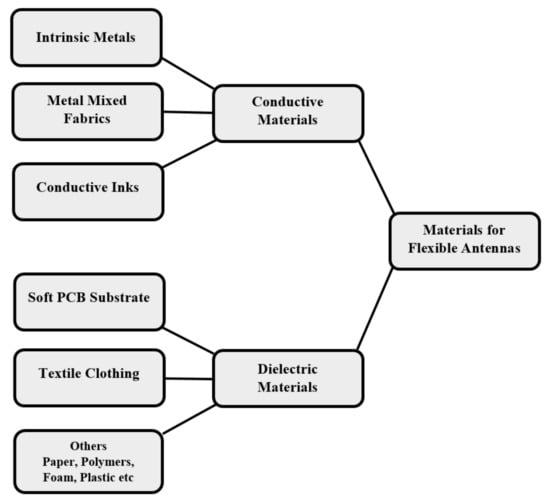 There are two major structural characteristics that form an antenna: a conductor and a dielectric, the essence of which is maintained for both the flexible and conventional antenna. The antenna operates by way of a conductive material used as a radiating element or a ground plane with a dielectric material to act as a substrate that supports the radiating element [142]. The materials that are commonly utilized for the conductive layer of the antennas include pure metals, like copper, aluminium and silver as examples of these intrinsic metals, metals mixed with fabrics like conductive polyester and conductive inks where silver nanoparticles are an example which allows an antenna to be printed on a substrate. Popular dielectric materials include polymers, paper, foam, plastic, textile fabrics and soft PCB.