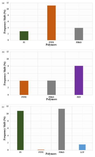 PDMS, commonly known as silicon, is an interesting polymer because of its softness and flexibility. PDMS has excellent rheological properties and is a flow-able, water-resistant, transparent and low-cost polymer with many attractive physical and chemical properties. Providing high deformability, flexible surface chemistry and low electrical conductivity [207,213,214], it is chemically inert due to its homogeneous and isotropic properties [215]. Indeed, PDMS has good chemical stability and a low dielectric constant between 2.3 to 2.8, see Table 4. The aforementioned advantages and excellent qualities have made PDMS a good substrate choice for stretchable and flexible antennas [68,69,70] for which it has, consequently, been used extensively as a substrate in electronic devices and microsystem fabrication [3].